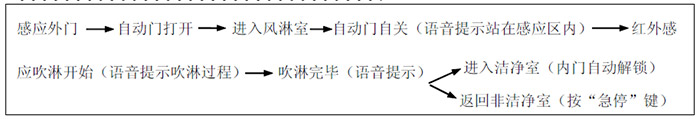 a.在內(nèi)外門關(guān)閉時(shí),按下手動(dòng)按鍵,系統(tǒng)即轉(zhuǎn)入風(fēng)淋過程3.2。