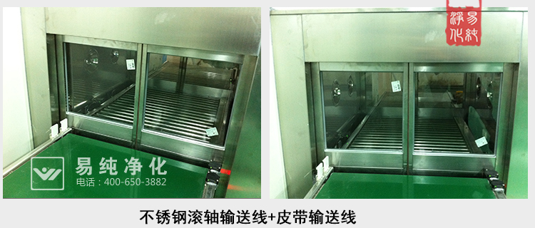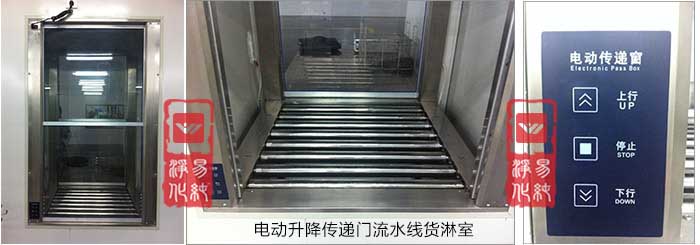 3、電動升降門貨淋室(門為電動控制上下升降),流水線被截斷成三部分,分別為潔凈區(qū)外,貨淋室內,潔凈區(qū)內;
