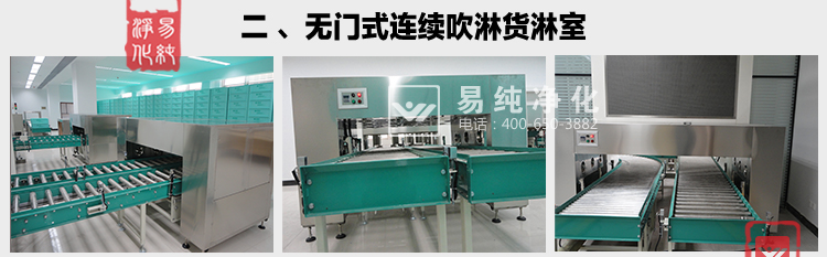 本文將重點介紹流水線貨淋室,此類貨淋室主要搭配輸送流水線配合使用。流水線是在一定的線路上連續(xù)輸進貨物搬運機械,又稱輸送線或者輸送機。按照輸送系列產品大體可分為皮帶流水線、滾筒線等流水線。一般包括牽引件承載構件、驅動裝置、改向裝置和和支撐件等,輸送機可進行水平輸送。在輸送的過程中避免了人工操作,只需要設置感應控制程序,當物體達到或進入貨淋室內時,貨淋室自動啟動吹淋,將進入潔凈室或包裝間的物體表面的灰塵吹干凈。
