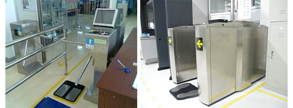 三輥閘,翼渣,進入方向配置ESD檢測儀和感應讀卡器,刷卡和靜電檢測合格后可以通行一人。外出方向也配置感應讀卡器以供公司自行設定成雙向通道。出口閘機配置外出感應讀卡器,可設置