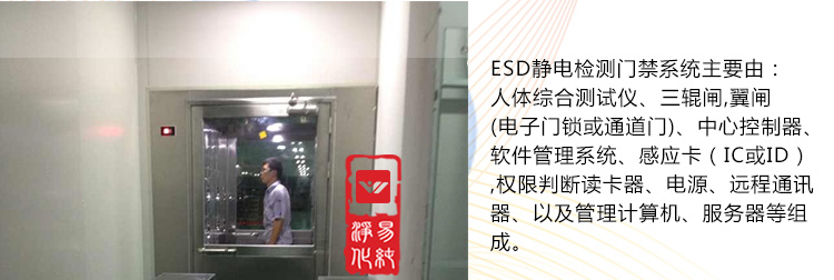 ESD靜電檢測門禁系統(tǒng)主要由:人體綜合測試儀、三輥閘,翼閘(電子門鎖或通道門)、中心控制器、軟件管理系統(tǒng)、感應卡(IC或ID),權(quán)限判斷讀卡器、電源、遠程通訊器、以及管理計算機、