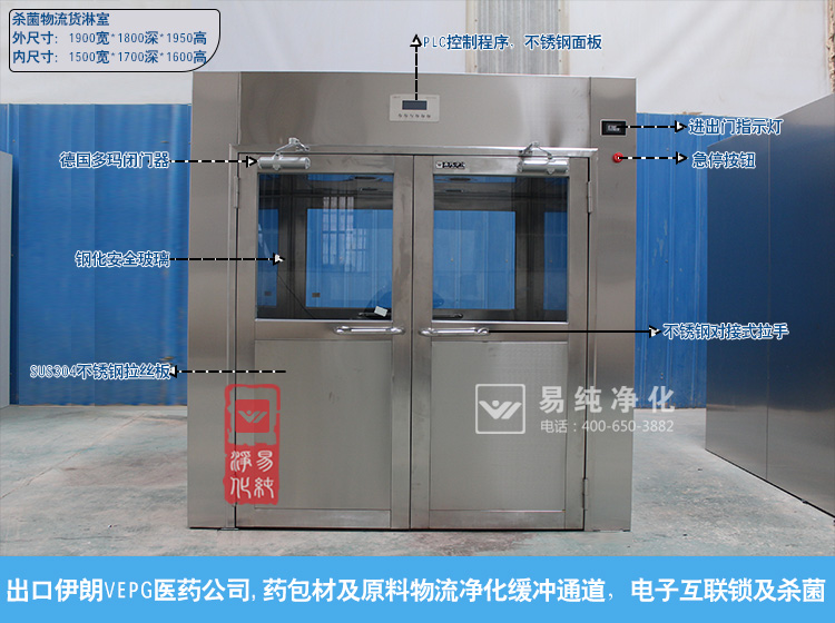 貨淋室門(mén)電子互鎖,可以兼起氣閘室的作用,防未被凈化的空氣進(jìn)入潔凈室,達(dá)到有效的凈化效果,經(jīng)高效過(guò)濾器過(guò)濾后的潔凈氣流由可旋轉(zhuǎn)噴嘴從各個(gè)方向噴射至物體表面,有效而迅速清除塵埃粒子,帶有塵埃粒子的空氣再由初、高效過(guò)濾器過(guò)濾后重新循環(huán)到風(fēng)淋區(qū)域。