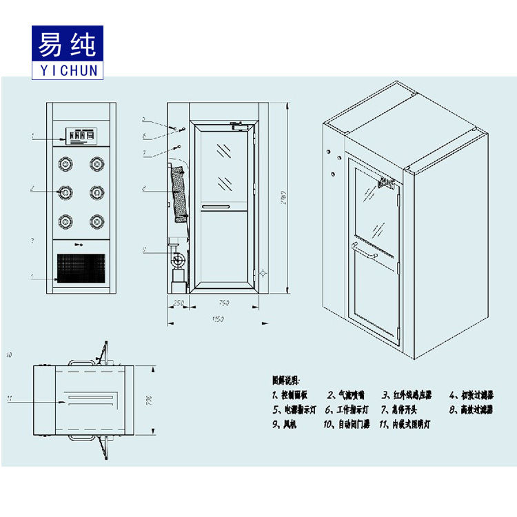 1.風(fēng)淋室由箱體、風(fēng)淋門、粗效過濾器、高效過濾器、風(fēng)機、靜壓箱、噴嘴聯(lián)鎖控制器,操作面板,感應(yīng)裝置等幾大部件組成。